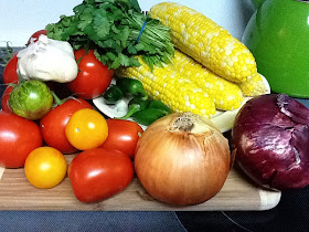 Even though it means summer is coming to an end I do so love when everything has ripened and amazing fresh vegetables are everywhere. After overloading my basket at a local farm I had to figure out what to do with my loot. This is an easy to make salsa, it has great flavor and is good for everyone since it's not too spicy.