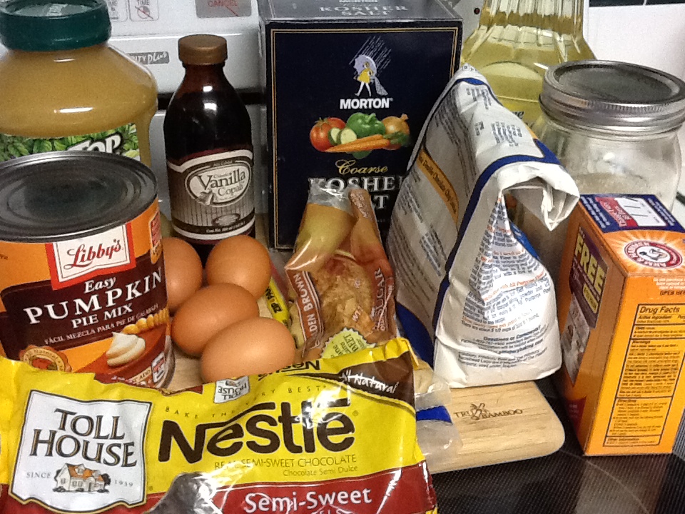 Mix the pumpkin pie mix, eggs, oil, applesauce and vanilla either by hand or with the mixer.