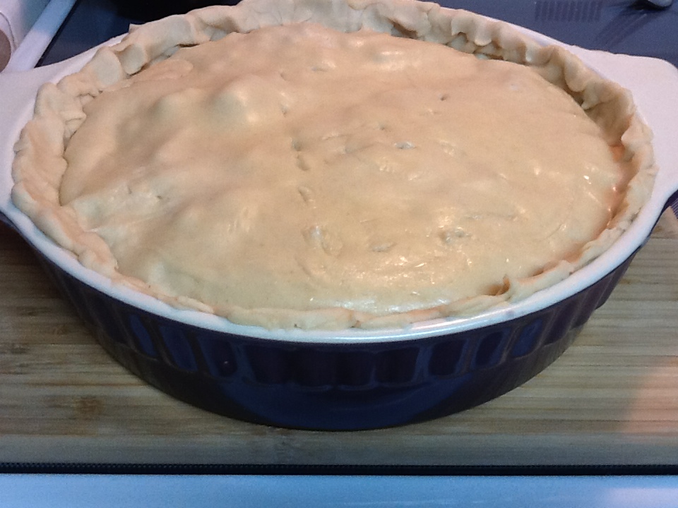 **The pie plate I used was about 2" deep, if you're using a standard pie plate you will have enough filling for at least two pies so plan accordingly. Also, in order to make the biggest most awesome pot pie ever I had to roll out the store bought dough to make it fit the giant plate, the resulting thinner crust was perfect.
