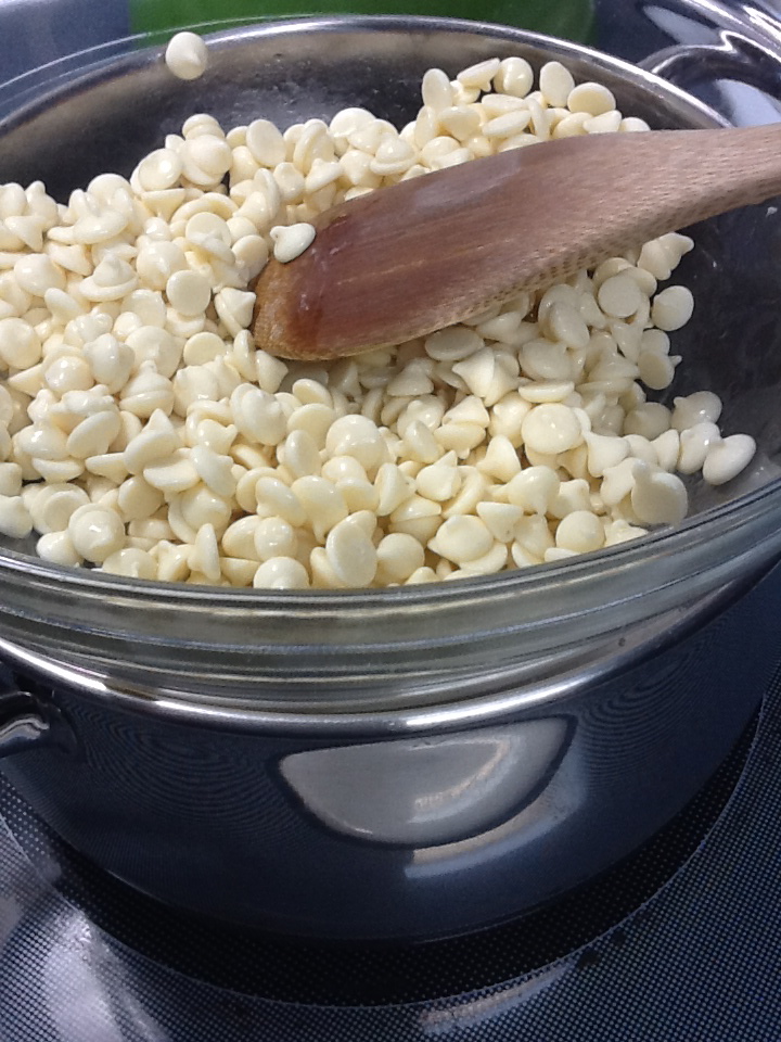 Melt the remaining white chocolate and put the final layer on, tilt the pan, or spread very gently, into an even layer.